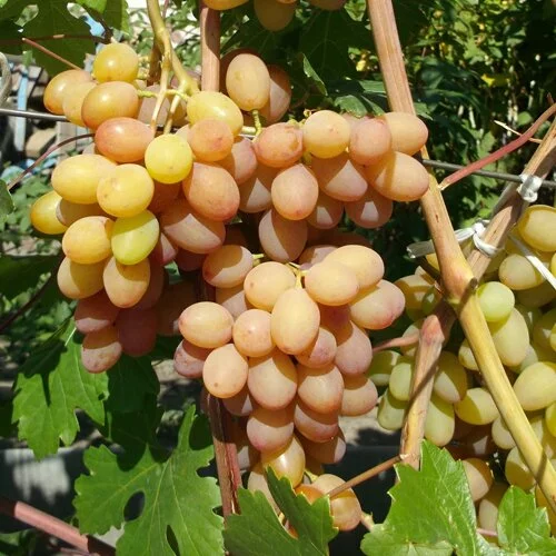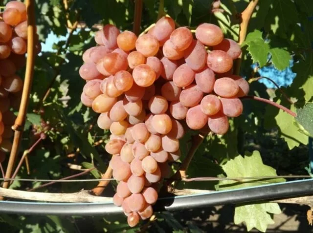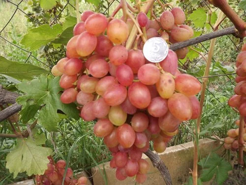 Собраны ягоды в крупные гроздья, весом в 700-900 гр, а зачастую они могут вырастать и до 1,5 кг. Размещение ягод в гроздях нельзя назвать очень компактным, ягоды в грозди почти не соприкасаются друг с другом, но и рыхлыми эти большие конусовидные или цилиндрические скопления ягод винограда тоже не выглядят.